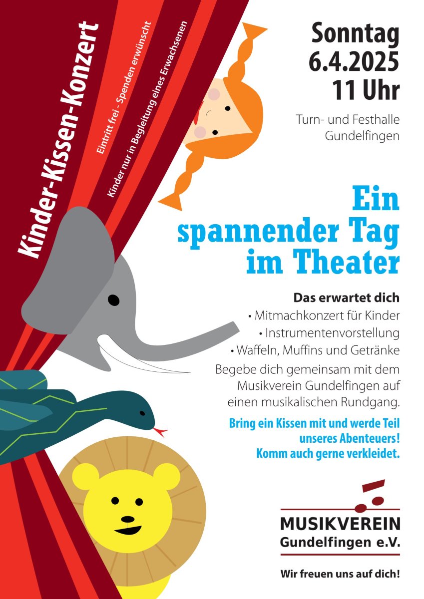 Bereits seit 4 Jahren proben wir jedes Jahr für die kleinen Zuhörerinnen und Zuhörer für ein Kinderkissenkonzert. Auch dieses Jahr haben wir wieder ein spannendes Mitmachprogramm. Am 06.04.2025 nehmen wir die Kinder mit zu einem spannendem Tag im Theater.